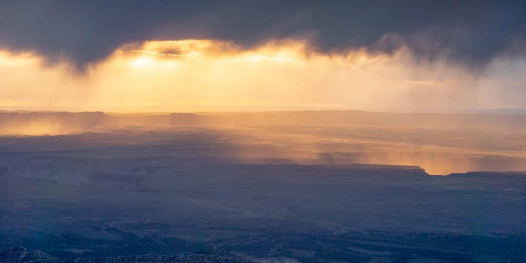 Der Anfänger fotografiert das Motiv – der Fortgeschrittene das Licht. Ich bin früh wach, und fotografiere dasselbe grandiose East-Rim-Panorama wie gestern Abend – und erhalte ein völlig anderes Bild. Fasziniert mache ich weiter; heraus kommen zwei ziemlich abstrakte Details des Panoramas, die so nur in der Morgensonne an einem Regentag möglich sind: