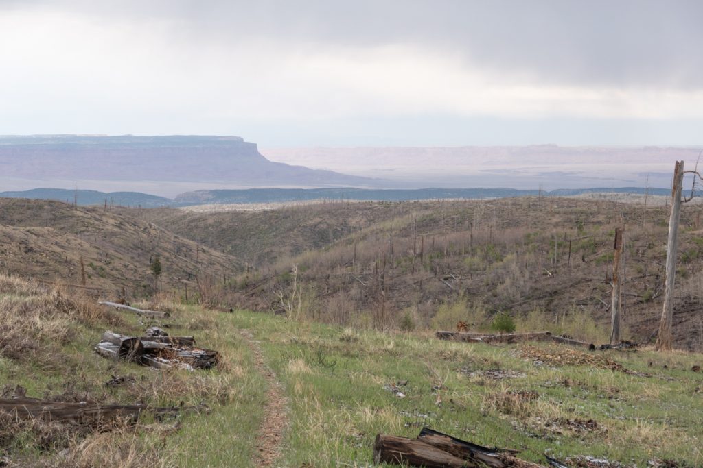 Entsprechend mache ich wenige Fotos und gehe schnell. Die Gedanken wandern zum Northern Terminus. Als ich vor zwei Jahren auf dem PCT unterwegs war, hatte ich keine Chance, den Weg abzuschließen. Dieses Jahr rückt diese Möglichkeit jetzt in greifbare Nähe! Das beflügelt mich, ich gehe schneller. Das Gelände ist einfach zu begehen, und so wird dies eine meiner längsten Tageswanderungen. Wie als Hinweis darauf, dass es hier nicht immer Regentage hat, komme ich noch einmal durch ein frisches Waldbrandgebiet: