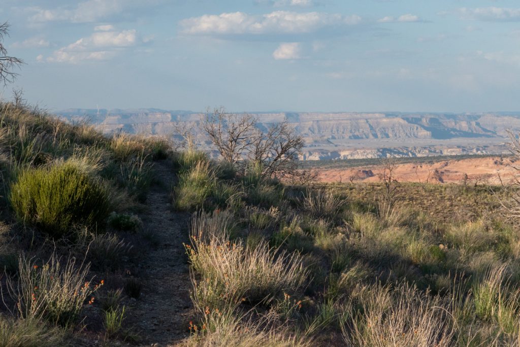 Eigentlich ist dieser Ort für Tiere gedacht, aber für Wanderer funktioniert er genauso gut. Dankbar fülle ich meine Flasche auf und gehe weiter. Push und Bear lasse ich bei einer Pause zurück – sie wollen definitiv noch eine Nacht hier oben bleiben. Ich bin unschlüssig und gehe weiter. Als es später wird, suche ich einen Zeltplatz – und treffe noch einmal auf Arizona in seiner rohen Form: „Everything that grows here has prickles“, so hatte ich es gelernt, alles, was hier wächst, hat Stacheln. Mein Versuch, das Zelt an einem einigermaßen unbewachsenen Wegstück aufzustellen, schlägt fehlt – dafür ist mein Ground Sheet jetzt mit Stacheln übersät, die fast alle Widerhaken zu haben scheinen. Auf der Suche nach einem besser geeigneten Zeltplatz laufe ich weiter und weiter – bis ich schließlich nach einer Wegbiegung am finalen Abhang der Wanderung ankomme. Ich treffe eine Entscheidung: Ich werde den Weg heute zu Ende gehen. Auf dem Weg nach unten fotografiere ich einen letzten Blick auf die großartige Canyon-Landschaft: